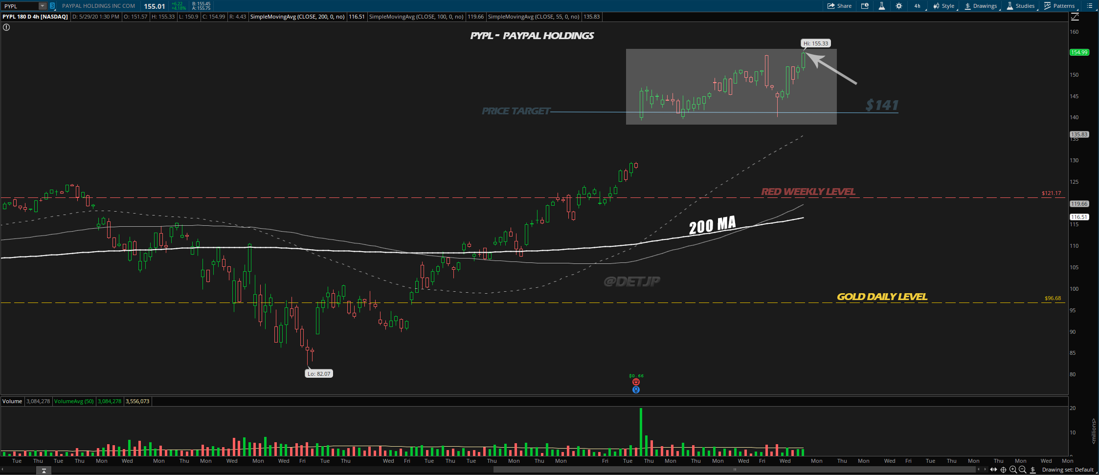 Trade Idea - $PYPL looks overbought here at all time highs. Option $141 Put contracts that will not expire for at least a month are fairly cheap at less than $200.
